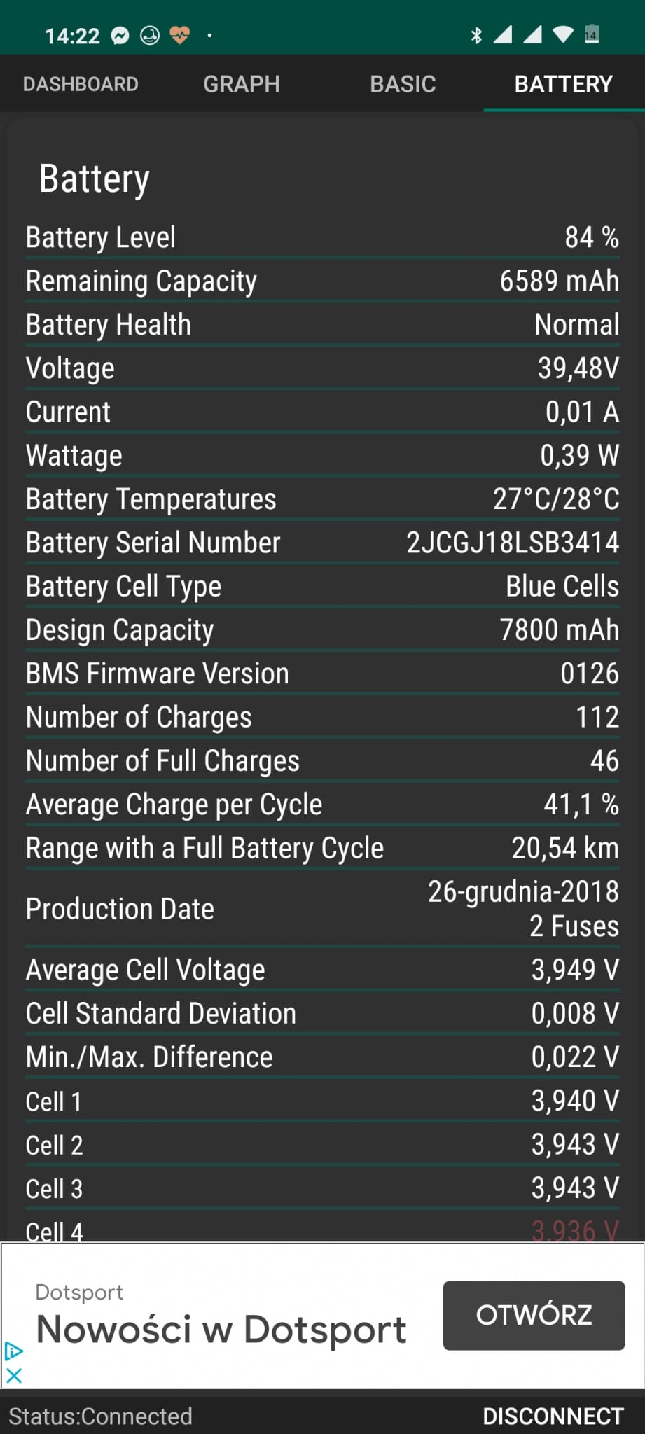 Należy sprawdzić przewód, wtyczki oraz gniazda na pcb dashboardu orac ESC. Jeśli jest brak uszkodzeń lub zimnych lutów lub urwanych ścieżek spowodowanych wstrząsami to: płytka dashboard-u do wymiany. Czyli ta na kierownicy z diodami.