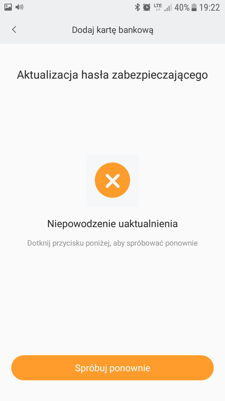szychalm Opublikowano 10 Grudnia 2022 Opublikowano 10 Grudnia 2022 (edytowane) Dzień dobry, mam problem z dodaniem karty. W tym nie jestem osamotniony, ale nie znalazłem takiego samego błędu, jaki pojawia się mnie. Aplikacja o konieczności "Aktualizacji hasła zabezpieczającego", a potem nieodmiennie, dziesiątki razy, stwierdza że jest ona niemożliwa. Próbowałem reinstalacji aplikacji, usuwania danych, skorzystania z innej aplikacji (Mi fit) - wszystko na nic. Oprogramowanie opaski jest aktualne. Nie chcę korzystać z dodatkowych aplikacji (np. Curve). Raport dot. błędu wysłany przez aplikację nie doczekał się odpowiedzi. Co może być przyczyną problemów? Dodatkowym tropem może być fakt, że aplikacja nie pokazuje żadnych banków na liście obsługiwanych. Edytowane 10 Grudnia 2022 przez szychalm