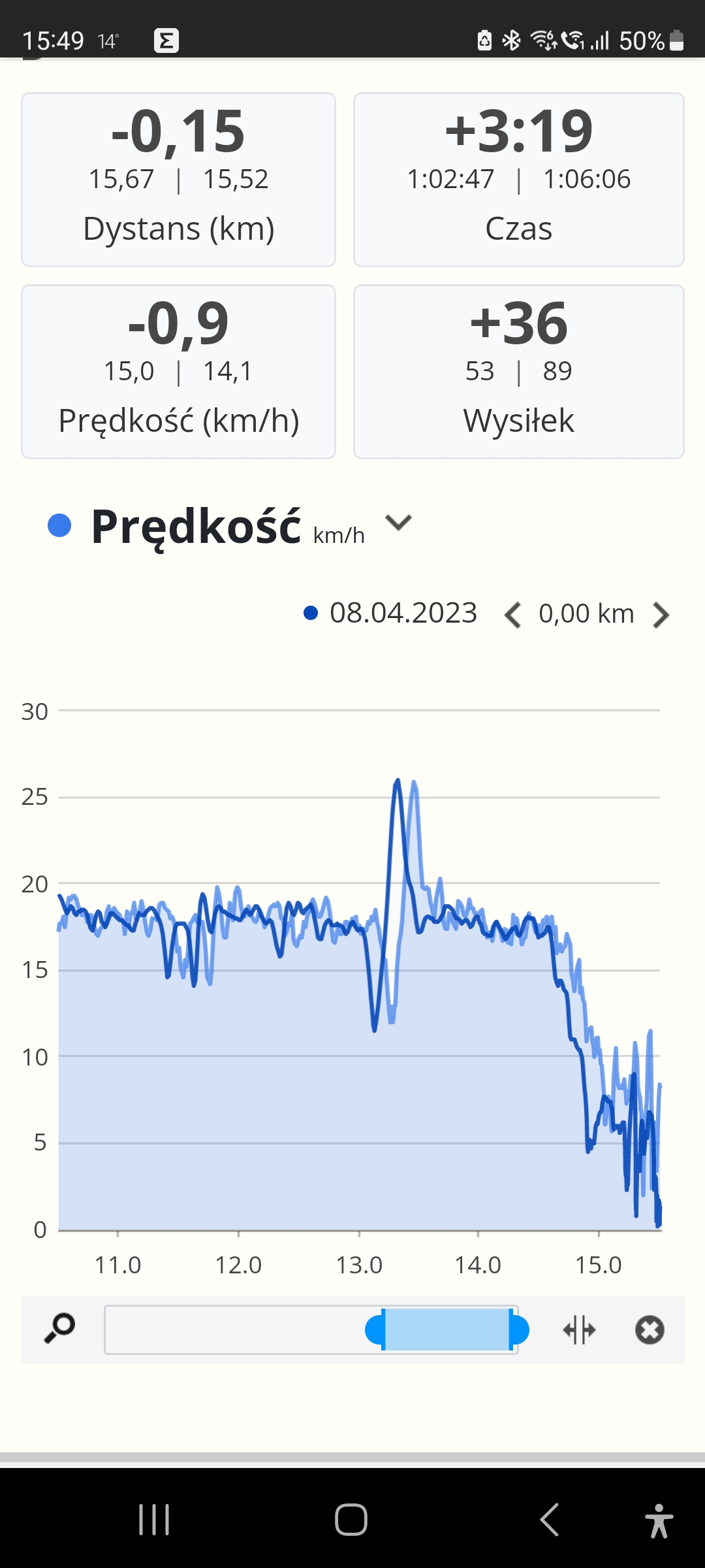 slimak131 Opublikowano 22 Listopada 2023 Autor Opublikowano 22 Listopada 2023 (edytowane) Rower fitness po asfalcie i szutrem, ostatnie 30 minut po trasie mtb. Gtr4 - niebieski/fioletowy. Opaska H808s - czerwony/pomarańczowy. Zoom I z powrotem. 30 minut po trasie mtb, potem szutrem i asfaltem. Zoom Ten sam fragment w zepp. Edytowane 23 Listopada 2023 przez slimak131