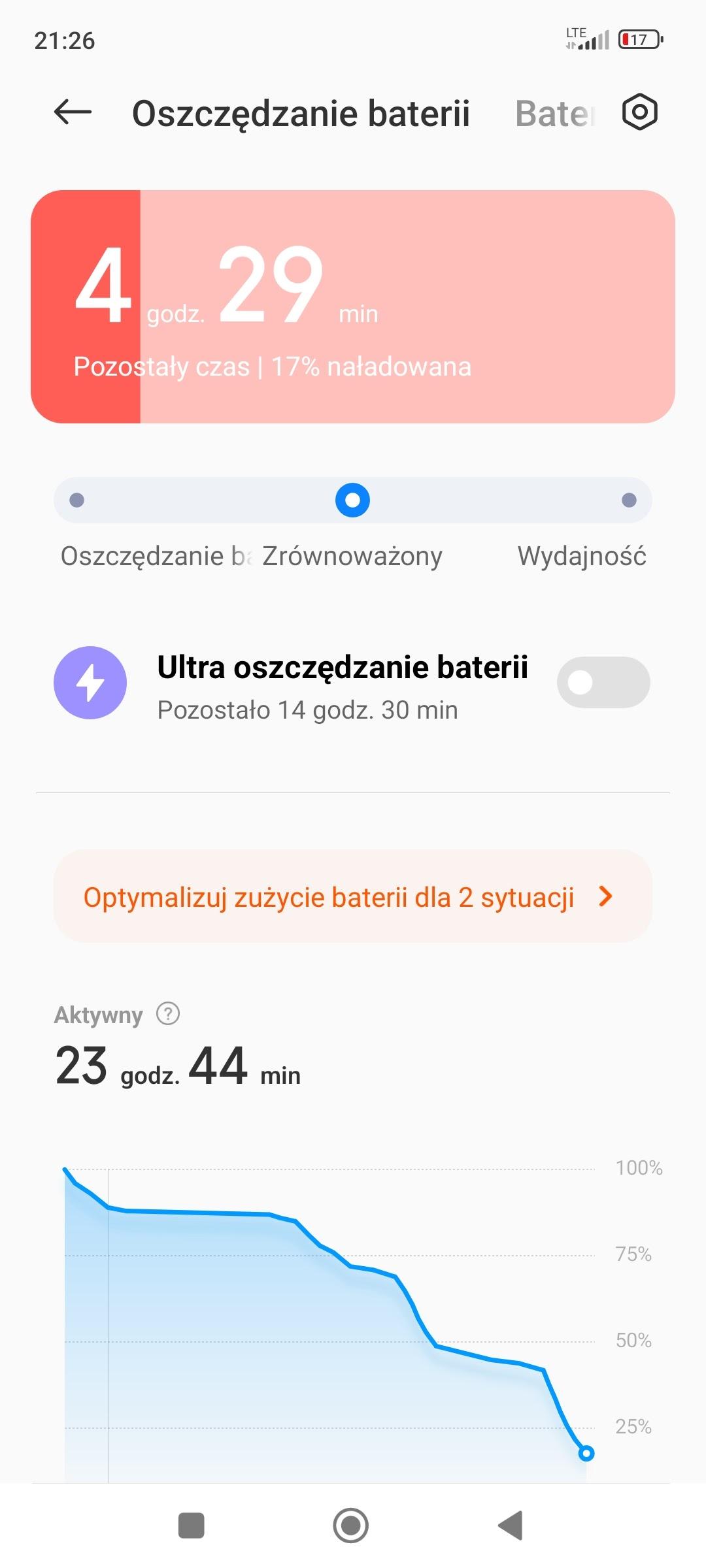allegroadam1 Opublikowano 30 Maja 2023 Opublikowano 30 Maja 2023 Witam, Od zeszłego tygodnia jestem (nie)szczęśliwym posiadaczem nowego Redmi 10 Pro 6/128. Telefon bardzo mi się podoba, wszystko działa elegancko ale jest 1 ale. A mianowicie bateria. Czytając fora, recenzje przed zakupem zwracałem uwagę na to, że użytkownicy tego telefonu osiągali bez problemu okolice 10 h SOT. I tu moje rozczarowanie, gdyż mi nie udało się nawet dobić do 6! Ostatni cykl to 5h39. A telefon nowy fabrycznie. Telefonu używam w większości tylko do przeglądania neta, także apka Chrome. Włączone 120hz, i transmisja danych 4g, reszta wyłączona, ekran ustawiony na ok. 30%. Powiedzcie czy to normalne? Czy coś z telefonem jest nie tak ? Dodam, że po naładowaniu do pełna pokazuje mi, że zostało 26h i 25 min, a czytałem na forach, że ponad 50h ludzie mają. Telefon ma androida 12 i MIUI 13.0.16 Dzięki z góry za wszystkie odpowiedzi i dołączam screeny.