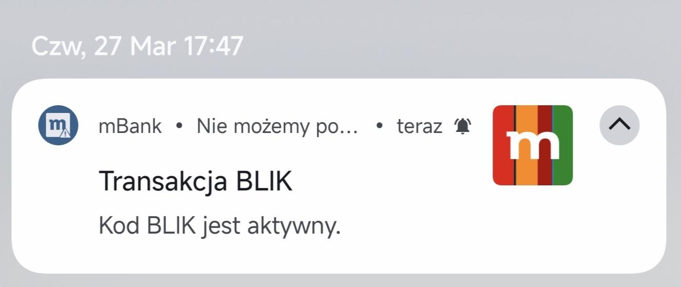 emoef Opublikowano 30 Marca 2025 Autor Opublikowano 30 Marca 2025 Panowie, przepraszam za dosc dluga nieobecnosc. Dziekuje za wszystkie podpowiedzi. Sparwa na chwile obecna wyglada w nastepujacy sposob: Dostaje powiadomienie, ze kod blik jest aktywny po chwili pokazuje sie maly wykrzyknik i komunikat nie mozemy po.... Nie moge tego rozciagnac ani w zaden sposob rozszyfrowac. Ustawienia aplikacji mBank: Czasem udaje sie aby platnosc przeszla to po wpisaniu kodu blik na stronie musze szybko przejsc spowrotem do aplikacji mBanku, jednak nie zawsze to dziala. Dzis czytalem recenzje xiaomi15 na stronie tabletowo i padl tam taki oto tekst: "Mam do niego właściwie tylko jedno zastrzeżenie: losowość dostarczania powiadomień. Testując smartfony Xiaomi nauczyłam się, że pierwsze, co trzeba zrobić po zainstalowaniu ważnych aplikacji, wejść w ich ustawienia i wszystko ustawić tak, by nie było żadnych ograniczeń w wypluwaniu powiadomień. Niestety, mimo to, te potrafią przyjść ze sporym opóźnieniem. Mam nadzieję, że wreszcie Xiaomi ogarnie ten temat, bo we flagowcu to aż nie przystoi, by takie coś miało miejsce." Z gory dziekuje jezeli ktos ma jeszcze jakies pomysy na rozwiazanie problemu.