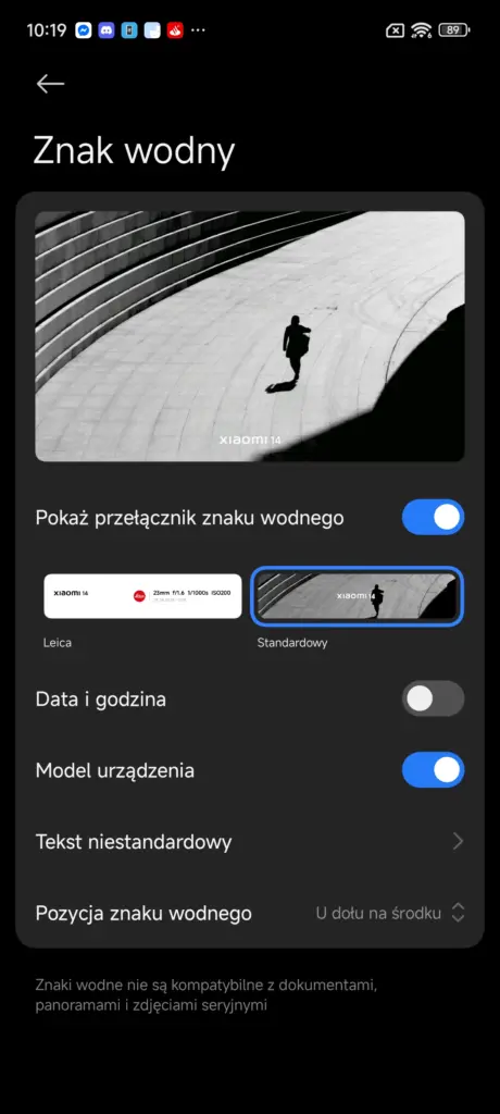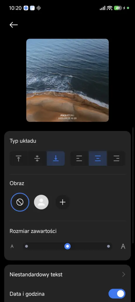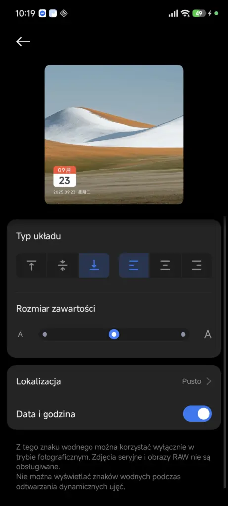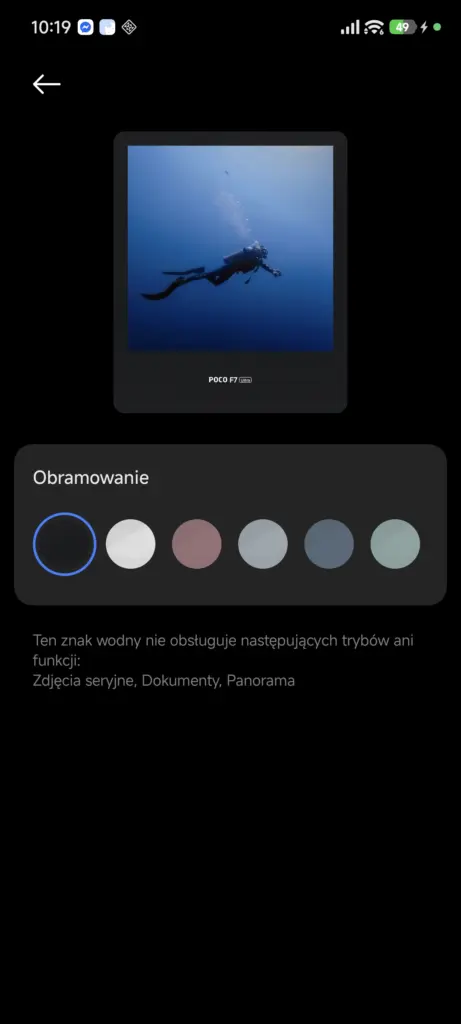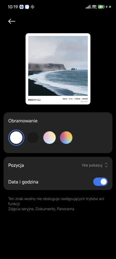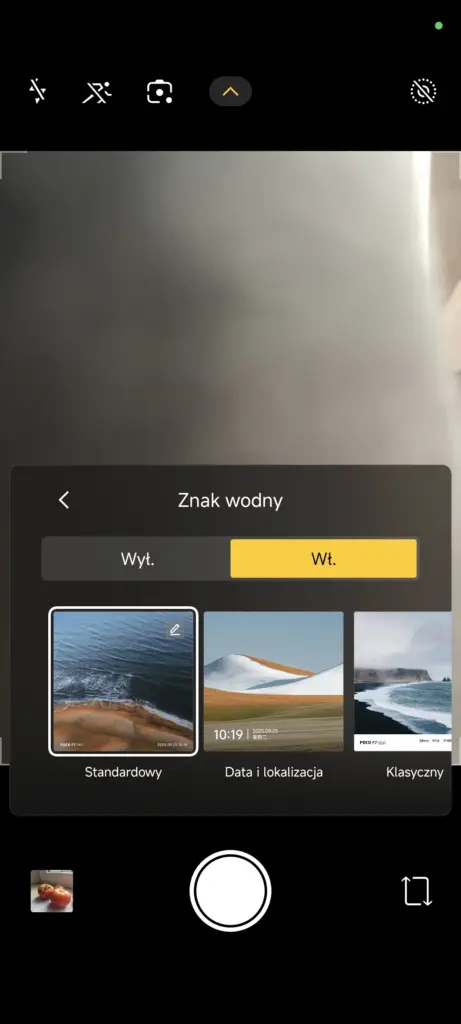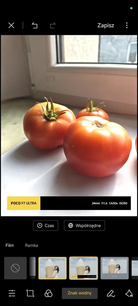 Interfejs aplikacji Aparatu praktycznie się nie zmienił. Najważniejszą nowością, jaką wprowadziło Xiaomi w nowej wersji Aparatu, jest znacznie rozszerzony wybór i możliwość edycji znaków wodnych. W Xiaomi 14 do dyspozycji mam tylko dwa znaki, które w dodatku mogę edytować w dość ograniczonym zakresie. W POCO F7 Ultra, na nowej nakładce, opcji personalizacji tego znaku wodnego jest znacznie więcej – są specjalne znaki wodne z lokalizacją czy klatką filmową, które do tej pory można było dodawać głównie już po zrobieniu zdjęcia, w edytorze.