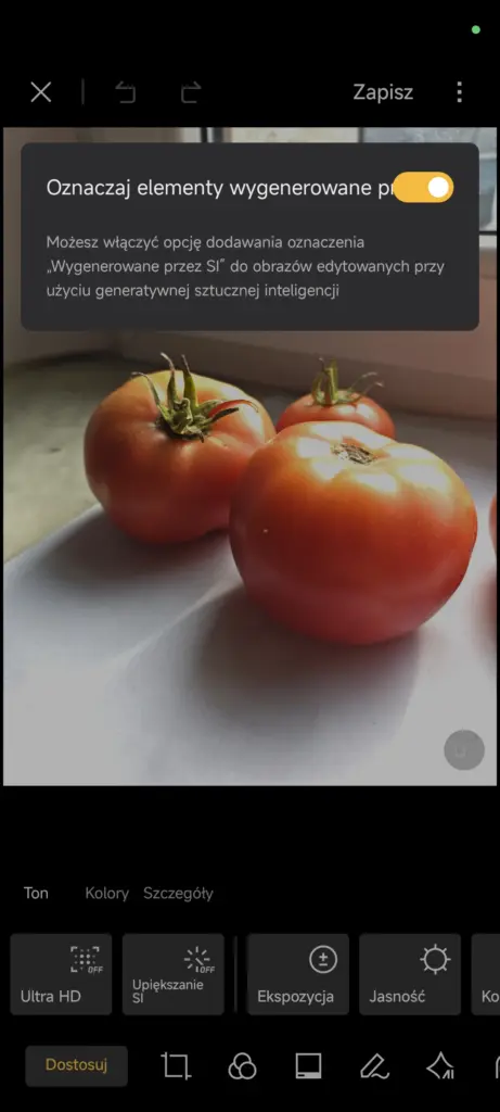 Kilka dni temu pojawiła się również globalna wersja nowego Edytora Galerii, który w Chinach jest dostępny od około dwóch miesięcy (ta zmiana też nie jest więc ekskluzywna dla HyperOS 3). Wprowadza ona widoczne gołym okiem zmiany w interfejsie – tryby są umieszczone teraz na dole ekranu w postaci ikon (wcześniej był tylko tekst), a opcje należące do danego trybu nie są już dostępne w kółkach, a w kwadratach. Dodane zostały objaśnienia dotyczące poszczególnych funkcji, można również włączyć bądź wyłączyć oznaczanie zdjęć wygenerowanych przez sztuczną inteligencję.