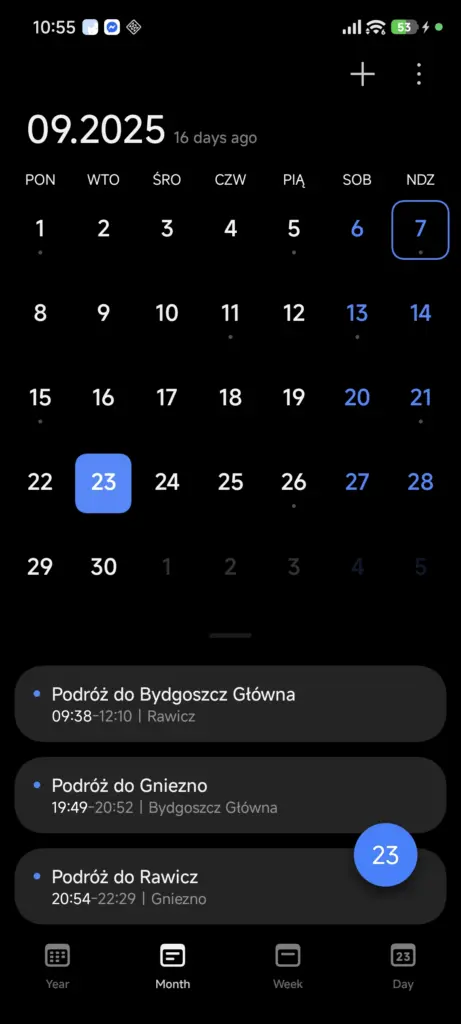 W aplikacji Kalendarz zmianie uległ układ aplikacji. Usunięto bowiem widok 3-dniowy, zastępując go widokiem tygodniowym. Dodano również opcję wyświetlenia widoku rocznego, który wcześniej trzeba było wywołać, dotykając roku na górze aplikacji. Wydarzenia zaplanowane na dany dzień zostały od siebie nieco oddzielone, zmieniono również kolor godziny rozpoczęcia danego wydarzenia. Nie można już niestety dodać (a przynajmniej ja takiej opcji nie widzę) lokalizacji danego wydarzenia.