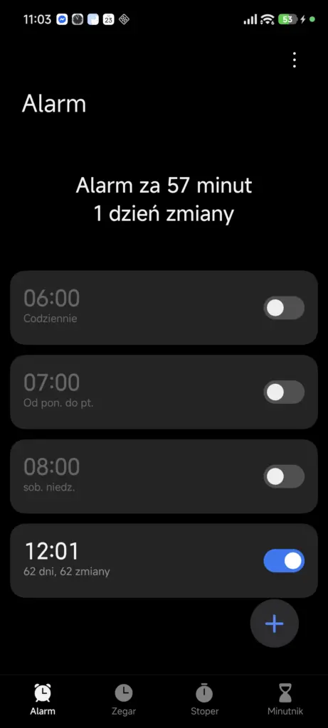 Zegar, poza już wspomnianym pokazywaniem informacji o stoperze czy minutniku w formie wyspy, otrzymał również nowy typ alarmu, jakim jest alarm zmianowy. W jego ramach możemy wyznaczyć różne godziny pobudki w zależności od tego, na jaką zmianę idziemy danego dnia. Jednego dnia możemy ustawić alarm np. na 6:00, a drugiego na 12:00. Jeśli danego dnia nie pracujemy, możemy wyłączyć alarm przeznaczony dla tego dnia.