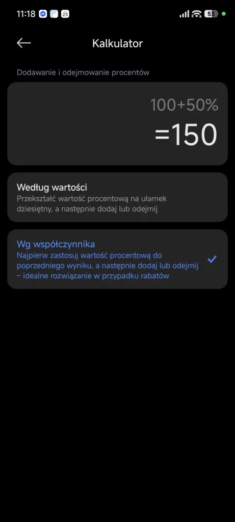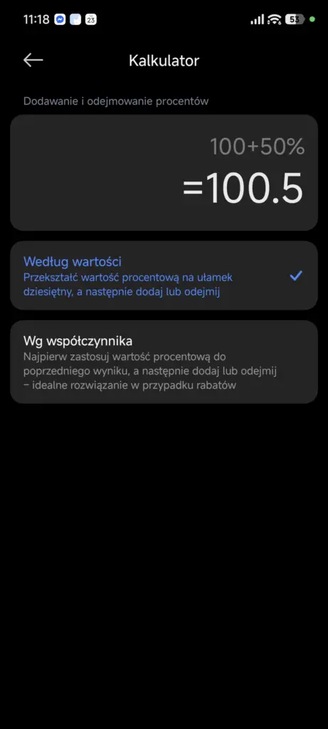 Sam interfejs Kalkulatora nie zmienił się drastycznie (nie licząc nowych ikon), lecz dodano w nim nowe ustawienie dotyczące dodawania i odejmowania procentów. Możemy tego bowiem dokonać na dwa sposoby: albo zamieniając procent na ułamek i dodawać bądź odejmować go od liczby, albo zastosować procent do poprzedniego wyniku, a potem go dodać bądź odjąć od tej liczby.