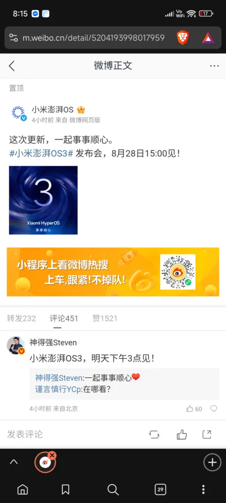 AKTUALIZACJA 27.08. 8:15: Xiaomi potwierdziło te informacje na Weibo. Jutro o 9:00 premiera HyperOS 3!