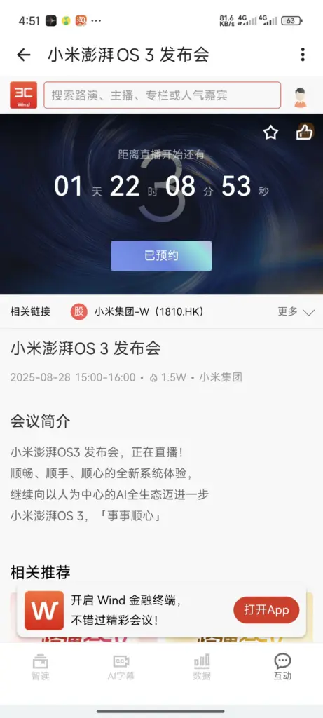 Według zrzutów ekranu, które pojawiły się między innymi w serwisie CoolAPK, Xiaomi zaplanowało w serwisie Wind 3C (chińskiej platformie pozwalającej między innymi na transmitowanie wydarzeń przez zarejestrowane tam spółki) transmisję, której tytuł i opis nie pozostawiają złudzeń – chodzi o premierę HyperOS 3. Miałaby ona mieć miejsce już w ten czwartek, 28 sierpnia, o 15:00 czasu chińskiego, czyli o 9:00 czasu polskiego.