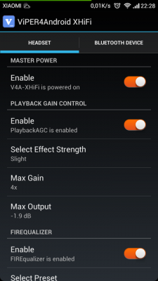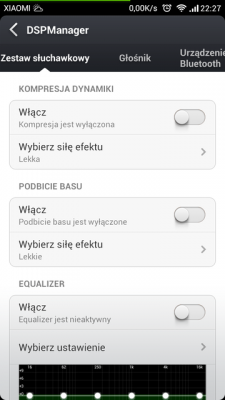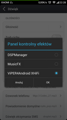 Dla użytkowników MI-2 dodaliśmy dwa modyfikowane equalizery dźwięku: DSPManager i ViPER4Android XHiFi. Obecność tych aplikacji nie psuje dźwięku Dolby Mobile w telefonie MI-2. W Ustawienia > Dźwięk mamy opcję „Efekty muzyczne” gdzie możemy wybrać aplikację, z której chcemy korzystać. Polecam wyłączyć Dźwięk Dolby Mobile (na dole listy w Dźwięki) i wybrać ViPER4Android XHiFi jako aplikację obsługującą dźwięk na słuchawkach. Na zrzutach ekranu dałem konfigurację aplikacji dającą fajny, mocny bas. Ponoć DSPManager może być używany do zwiększenia głośności maksymalnej głośnika telefonu. Nie sprawdzałem.