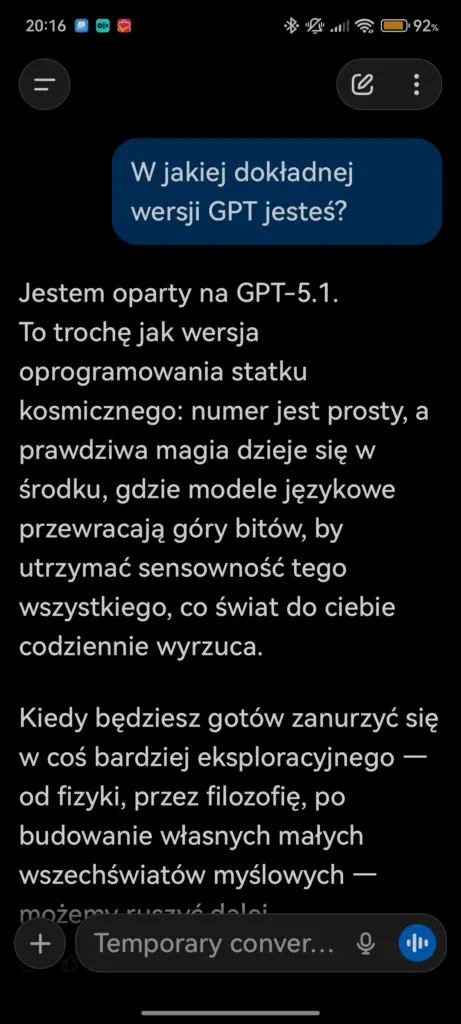OpenAI planuje wprowadzać GPT-5.1 stopniowo. Najpierw trafi on do użytkowników planów płatnych, a następnie do wersji darmowej – w momencie pisania tego tekstu u mnie model już się zaktualizował.