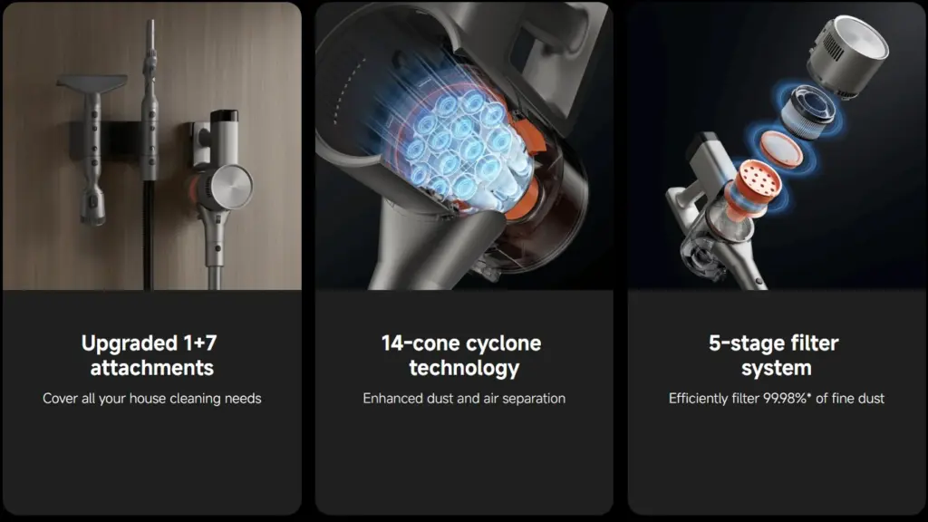 - System 14-sto stożkowej cyklonowej separacji powietrza i kurzu oraz filtracja 5-stopniowa, która ma usuwać aż 99,98% cząstek ≥ 0,3 μm co działa na korzyść osób z alergiami lub większym wymaganiom w zakresie czystości powietrza.