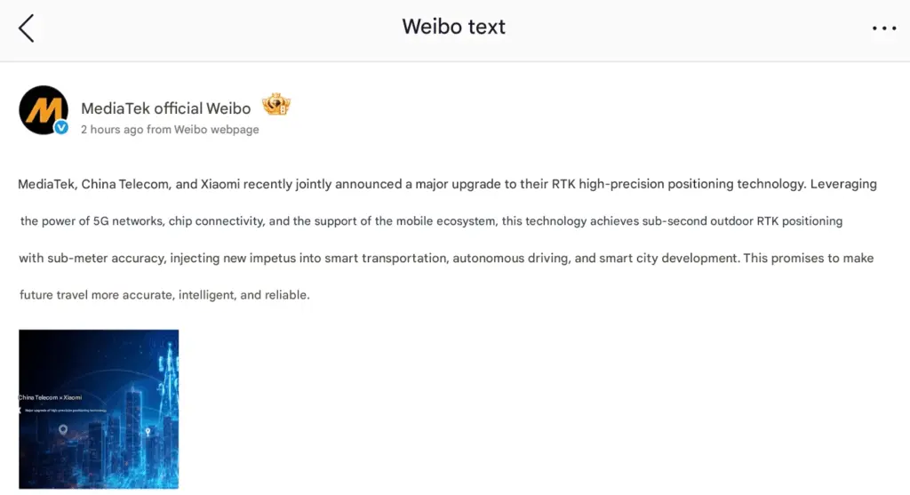 Oświadczenie to zostało opublikowane wczoraj w oficjalnym poście MediaTek na chińskim portalu Weibo. To wspólne osiągnięcie oznacza znaczący przełom w dokładności pozycjonowania i reakcji w czasie rzeczywistym, integrując moc łączności 5G, zaawansowaną konstrukcję chipów i inteligentny ekosystem Xiaomi.