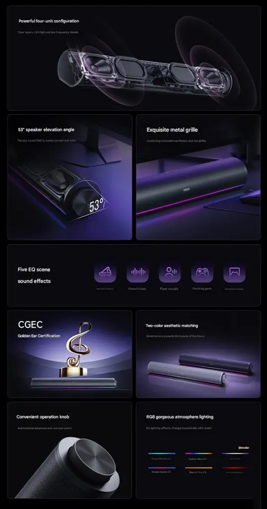 Produkt ten jest pozycjonowany jako wysokiej klasy rozwiązanie audio do komputerów stacjonarnych, a nabyć go można w cenie 369 juanów (około 188 zł). Wyposażono go w konfigurację czterech głośników – dwa okrągłe głośniki o mocy 10 W i dwa pasywne głośniki basowe – zintegrowane w nowoczesnej, cylindrycznej obudowie. System wykorzystuje zaawansowaną technologię DSP, zapewniającą lepszą jakość dźwięku jak i bezproblemową łączność między wieloma platformami.
