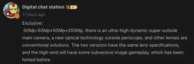 Znany bloger z chińskiego portal Weibo o pseudonimie Digital Chat Station ujawnił szczegóły dotyczące konfiguracji aparatów Xiaomi 17 Ultra. Według niego nadchodzący smartfon wyposażony ma zostać w poczwórny aparat, w skład którego wejdą matryce o rozdzielczości 50 MP + 50 MP + 50 MP + 200 MP. Główny aparat będzie wyposażony w duży sensor z obsługą ultrawysokiego zakresu dynamiki. Co więcej, obiektyw peryskopowy może zostać wyposażony w nową technologię optyczną.