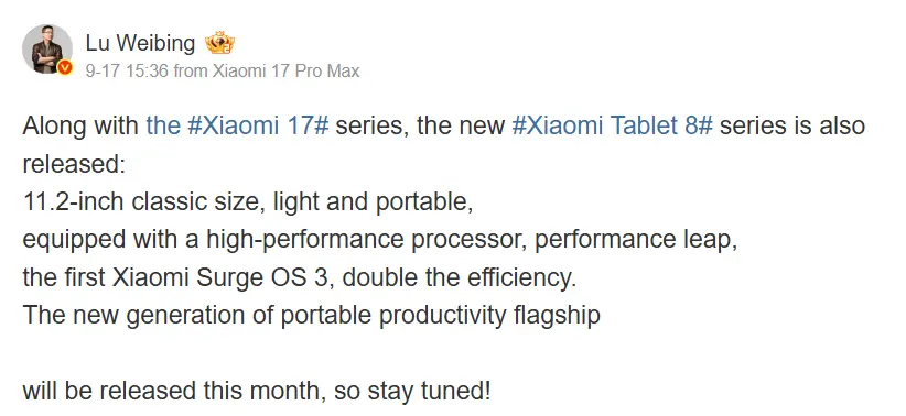 We wpisie Lu Weibinga na Weibo czytamy, iż Pad 8 będzie wyposażony w klasyczny wyświetlacz o przekątnej 11,2 cala, ale nadal ma być lekki i poręczny. Otrzyma on również wydajny procesor i pracować ma pod kontrolą autorskiego systemu operacyjnego Xiaomi HyperOS 3 opartym na Androidzie 16.
