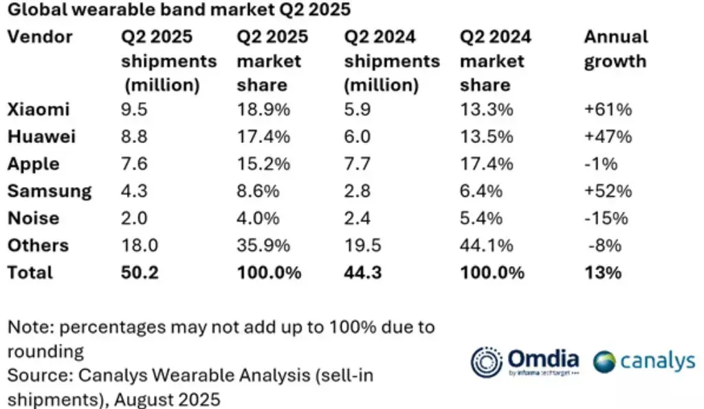 Według najnowszego raportu opublikowanego przez firmę analityczną Omdia, w drugim kwartale 2025 roku globalna sprzedaż inteligentnych opasek osiągnęła 50,2 miliona sztuk, co oznacza 13% wzrost w skali roku. W tym kontekście Xiaomi okazało się najszybciej rozwijającym się producentem z największą liczbą sprzedanych inteligentnych opasek, wyprzedzając długoletnich konkurentów, takich jak Huawei, Apple, Samsung i indyjska marka Noise.