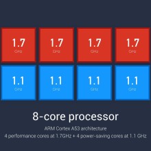 - Snapdragon 615 SoC (64 bit) – Cortex-A53 4 x 1.7GHz + 4x 1.1 GHz