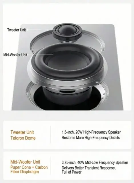 Od strony technicznej Sound 2 Pro wykorzystuje dwudrożny układ akustyczny z dedykowaną zwrotnicą. Zestaw obejmuje 40-watowy przetwornik średnio-niskotonowy oraz 20-watowy głośnik wysokotonowy, co daje łączną moc wyjściową 60 W. Taka konfiguracja zapewnia zbalansowane brzmienie, wyraźne wysokie tony oraz głęboki, kontrolowany bas.