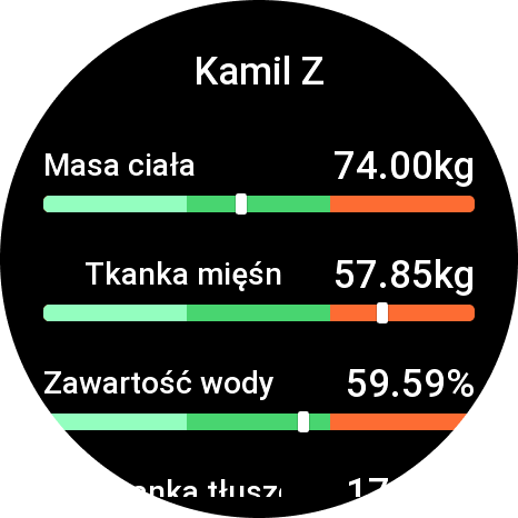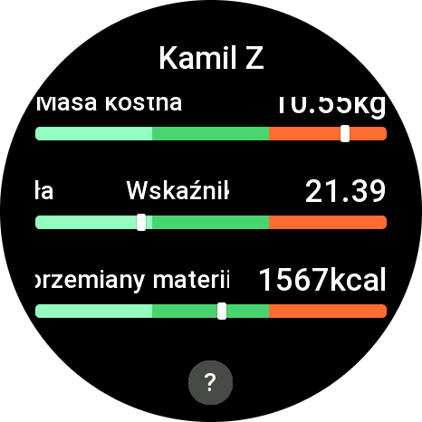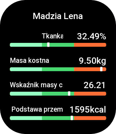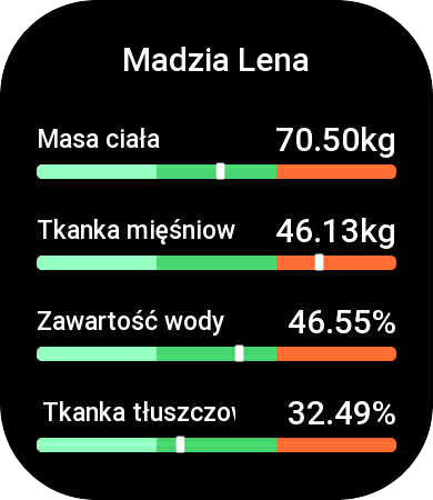 Dzięki poniższemu przykładowemu kodowi, twórcy niestandardowych tarcz mogą w łatwy sposób wyświetlać dane z aplikacji Skład Ciała bezpośrednio na swoich tarczach, co pozwala na jeszcze większą personalizację i wygodę: